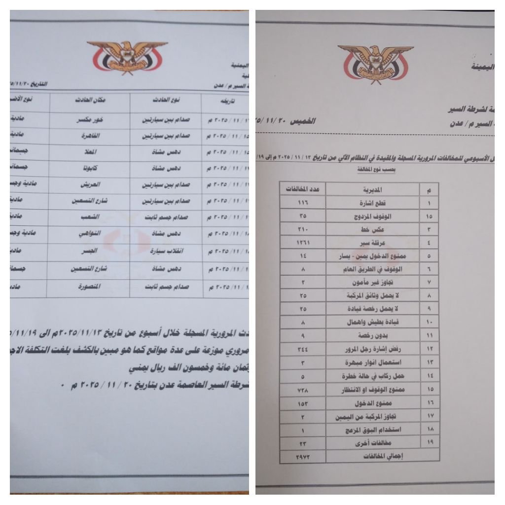 شرطة السير بعدن ترصد 2972 مخالفة مرورية خلال أسبوع.