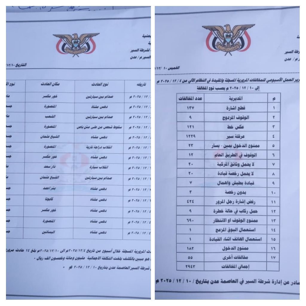 شرطة السير في عدن تعلن إحصائية المخالفات والحوادث المرورية للأسبوع الأول من ديسمبر.