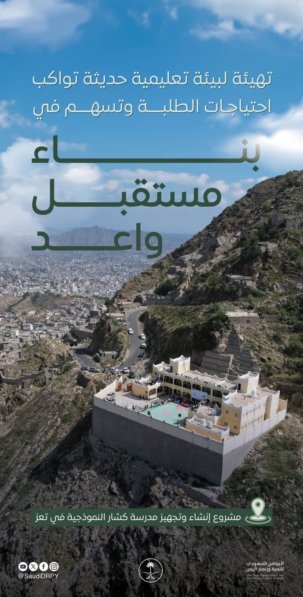 البرنامج السعودي يعزز التعليم في تعز عبر مشروع مدرسة كشّار النموذجية.