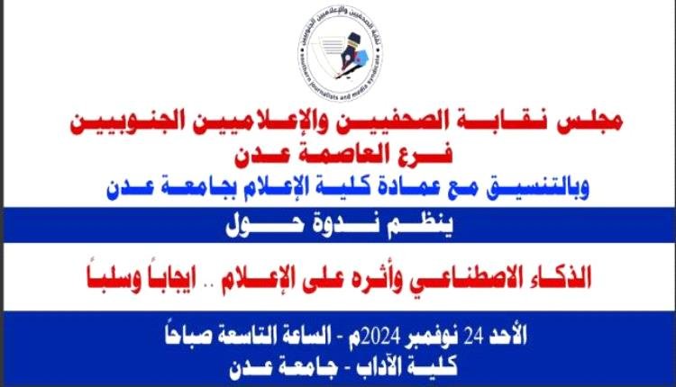 نقابة الصحفيين الجنوبيين فرع عدن تنظم ندوة علمية حول تأثير الذكاء الاصطناعي على الإعلام.