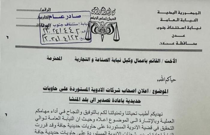 النيابة توجه بإلزام شركات الاستيراد بإعادة حاويات الأدوية المخالفة إلى بلد المنشأ.