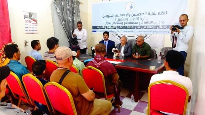 دائرة التدريب والتأهيل بنقابة الصحفيين والإعلاميين الجنوبيين تنظم ورشة بعنوان دور وسائل الاعلام في نشر ثقافة التصالح والتسامح والتنمية بمقر مجلس نقابة فرع لحج.