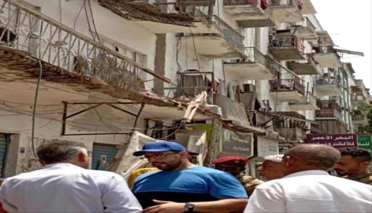 الوكيل السقاف يتفقد مكان انهيار شرفات إحدى عمارات الشارع الرئيسي بالمعلا.