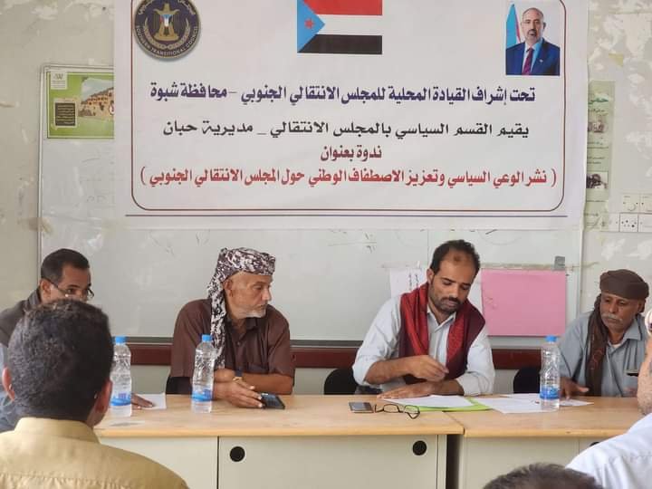 انتقالي حبان ينظم ندوة سياسية بعنوان "نشر الوعي السياسي وتعزيز الاصطفاف الوطني حول المجلس الانتقالي الجنوبي".
