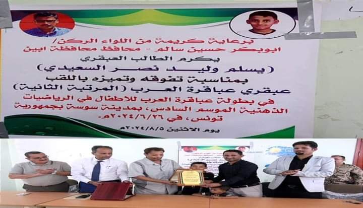 محافظ ابين يكرم النابغة العبقري وليد السعيدي الفائز بالمركز الثاني في مسابقة الحساب الذهني بالجمهورية التونسية.
