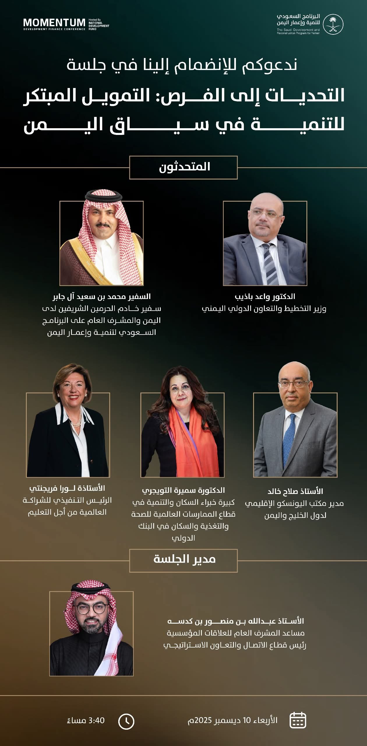 البرنامج السعودي لتنمية وإعمار اليمن يعقد جلسة حوارية حول “التمويل المبتكر للتنمية في سياق اليمن” ضمن مؤتمر التمويل التنموي بالرياض.
