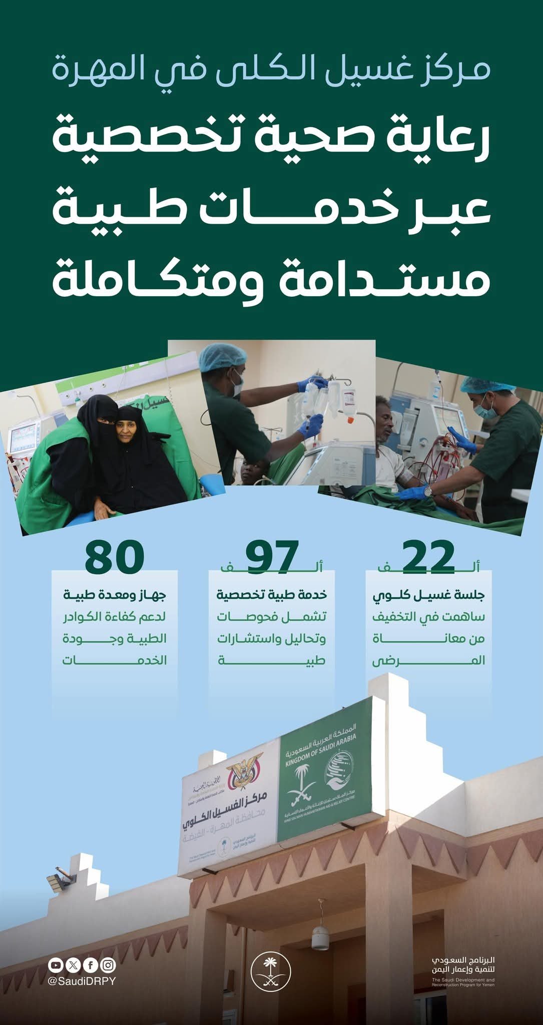 البرنامج السعودي يدعم مركز غسيل الكلى في المهرة ضمن جهوده المتواصلة لتعزيز البنية التحتية للقطاع الصحي.