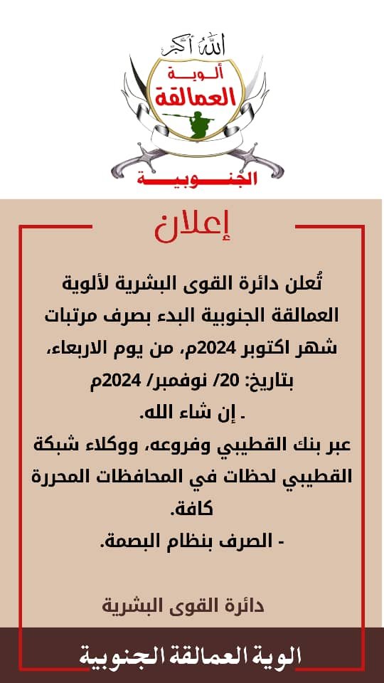 ألوية العمالقة الجنوبية تعلن عن بداء صرف مرتبات منتسبيها لشهر اكتوبر