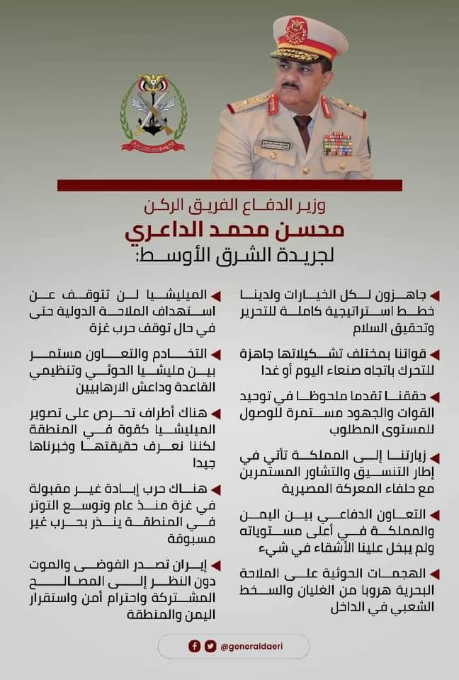 وزير الدفاع اليمني يستبعد توقف الهجمات الحوثية حتى لو انتهت حرب غزة قال لـ «الشرق الأوسط» إنه متفائل رغم الصعوبات أمام اللجان العسكرية.