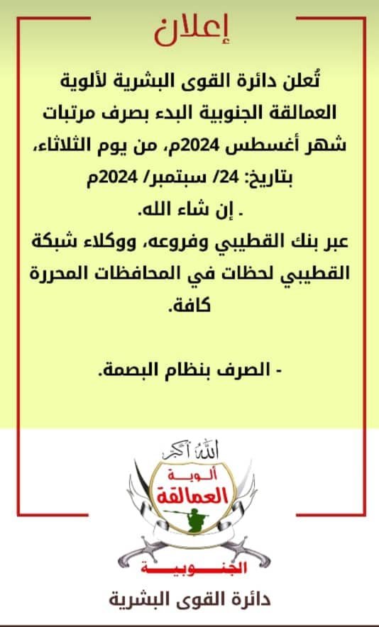 ألوية العمالقة الجنوبية تعلن عن بداء صرف راتب شهر أغسطس ٢٠٢٤ م لكافة منتسبيها.