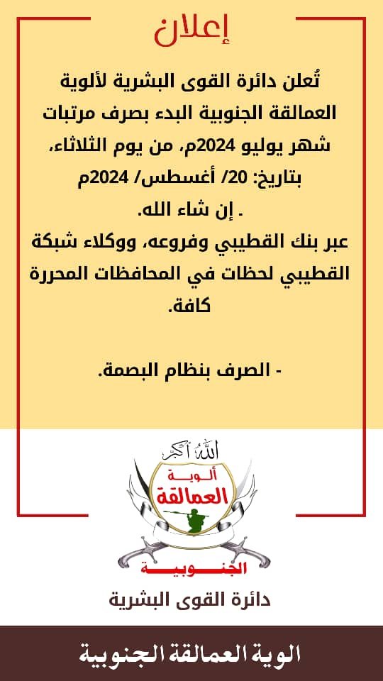 ألوية العمالقة الجنوبية تعلن عن بدأ صرف راتب شهر يوليو لجميع منتسبيها.