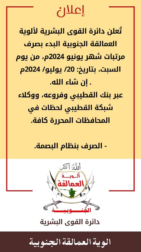 ألوية العمالقة الجنوبية تعلن عن بدء صرف المرتبات لشهر يونيو من هذا العام.