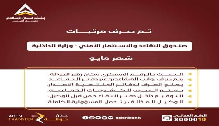 بدء صرف معاش مايو 2024م لمتقاعدي الداخلية والأمن عبر بنك عدن للتمويل الأصغر.