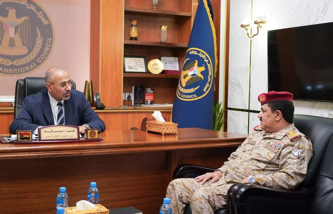 الرئيس القائد عيدروس الزُبيدي يطّلع من وزير الدفاع على مستجدات الأوضاع الميدانية في جبهات القتال.
