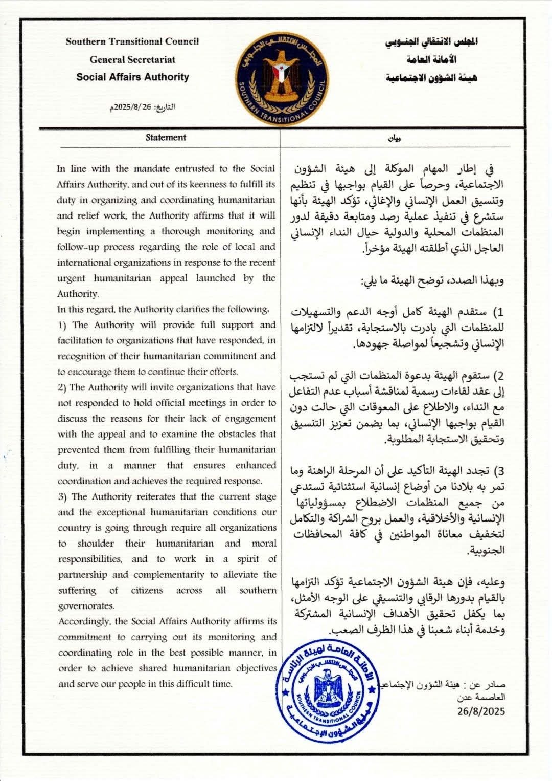 هيئة الشؤون الاجتماعية بالانتقالي تعلن بدء متابعة استجابة المنظمات للنداء الإنساني العاجل
