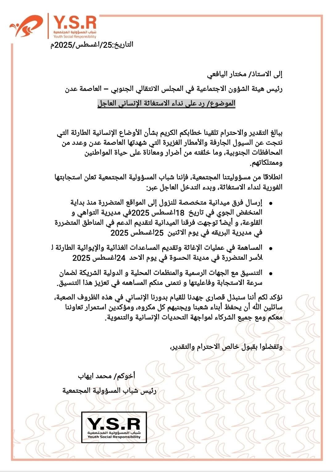 هيئة الشؤون الاجتماعية بالانتقالي تشكر شباب المسؤولية المجتمعية على استجابتهم العاجلة في عدن.