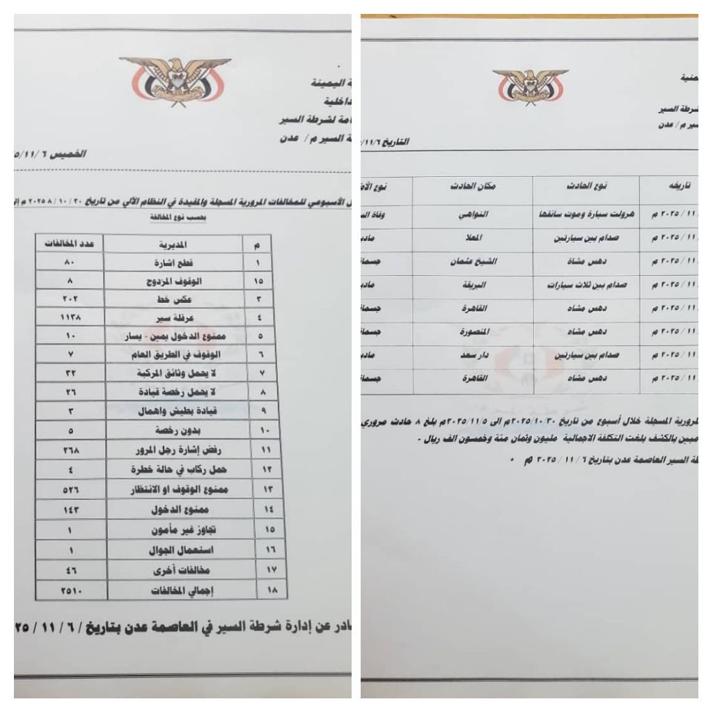 شرطة السير بعدن تسجل أكثر من 2500 مخالفة مرورية خلال أسبوع.