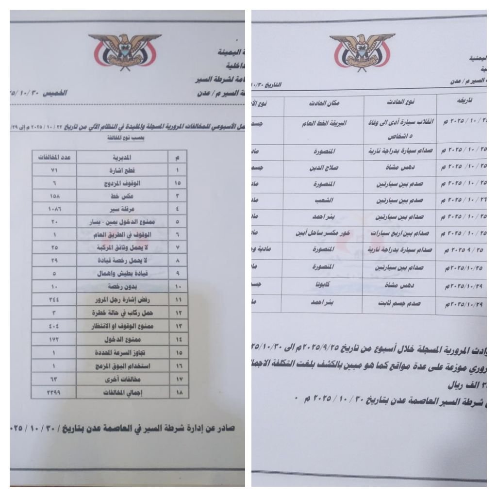 شرطة السير بعدن تسجل أكثر من ألفي مخالفة مرورية خلال أسبوع.