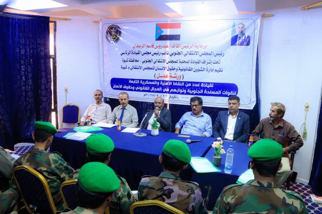 انتقالي شبوة ينظم ورشة عمل في الجوانب القانونية وحقوق الإنسان لقيادات النقاط الأمنية والعسكرية