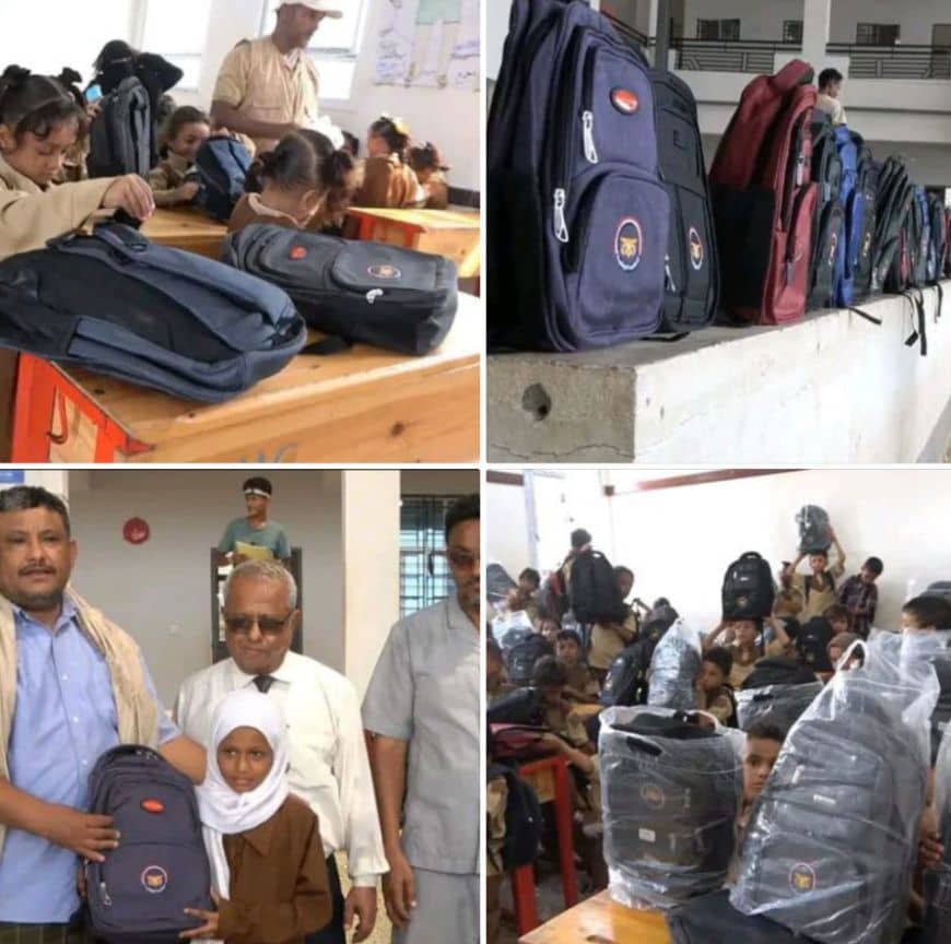 خلية الأعمال الإنسانية توزع 2000 حقيبة مدرسية مع مستلزماتها للطلاب في حيس بمحافظة الحديدة.