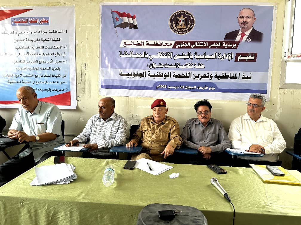 انتقالي الضالع يناقش تعزيز اللحمة الوطنية ونبذ المناطقية، في حلقة نقاشية موسعة