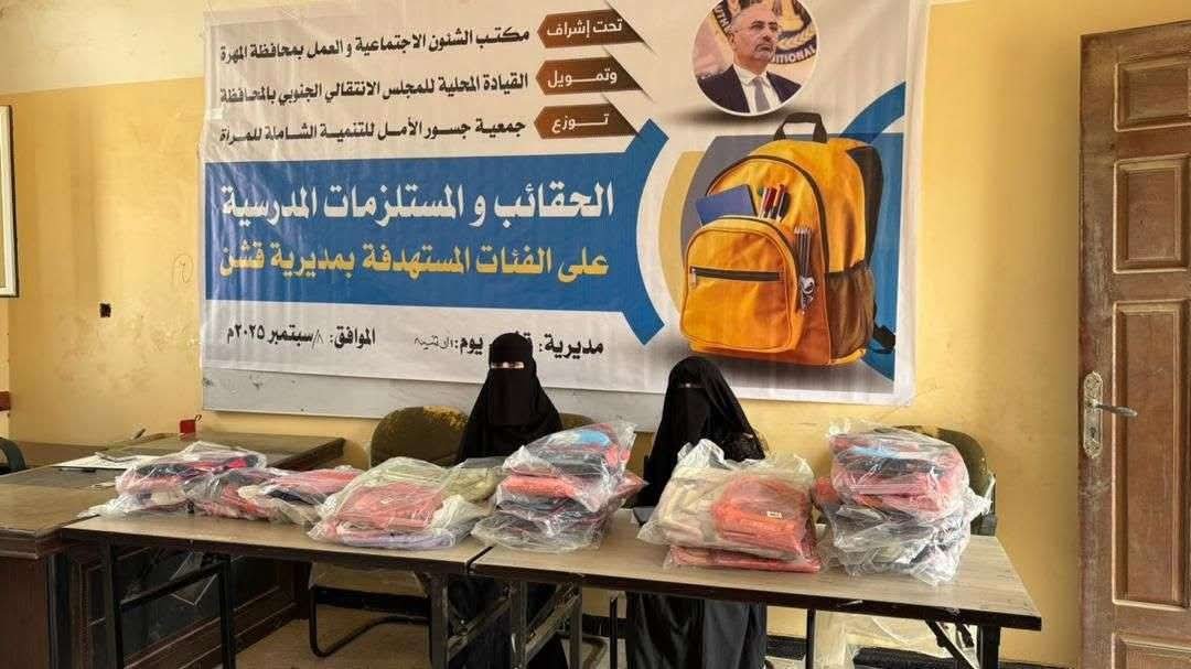 بدعم من انتقالي المهرة.. جمعية مراسيل تدشن مشروع توزيع المستلزمات المدرسية على الطلاب