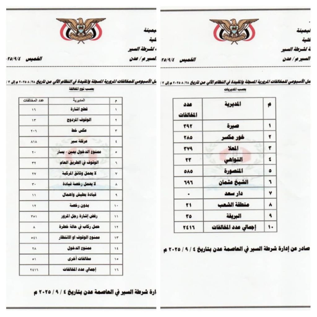 شرطة السير بعدن: 2416 مخالفة و5 حوادث مرورية خلال أسبوع