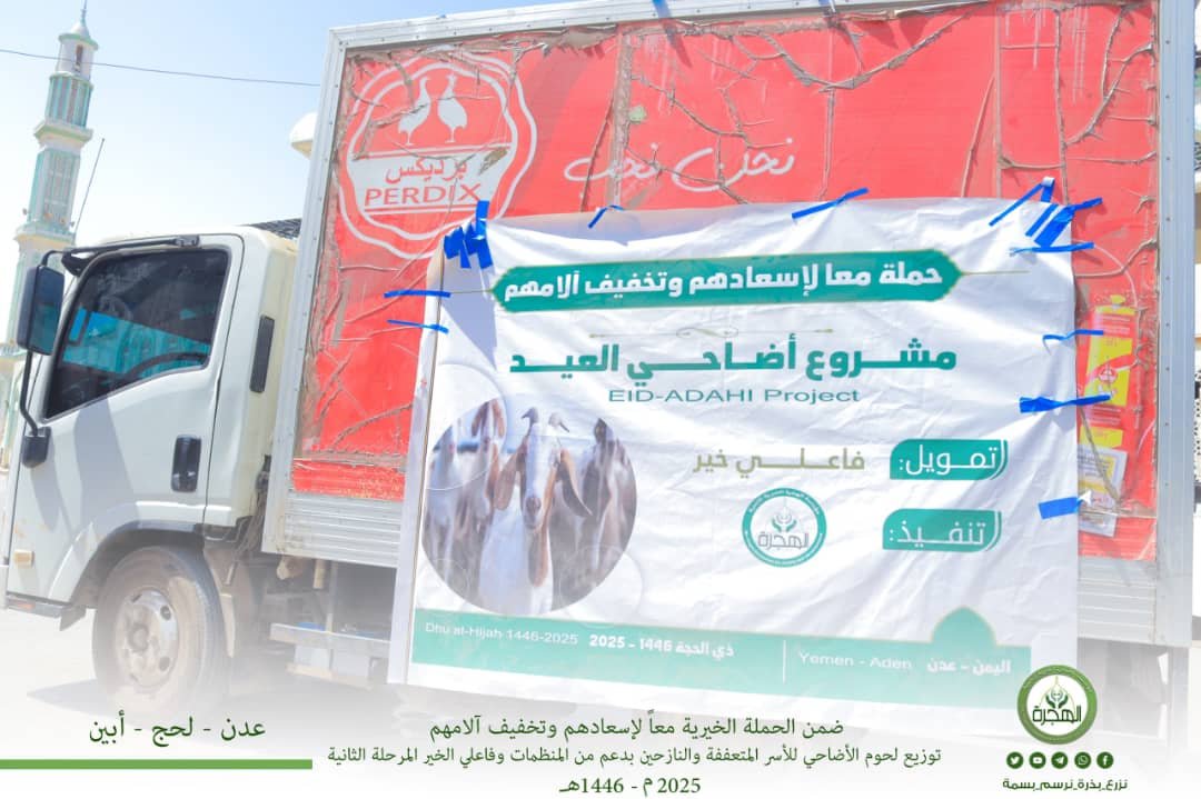برعاية عدد من المنظمات الدولية والخيرية... مؤسسة الهجرة تختتم حملة "معاً لإسعادهم" بتوزيع لحوم الأضاحي لأكثر من 700 أسرة بعدن ولحج وأبين والضالع