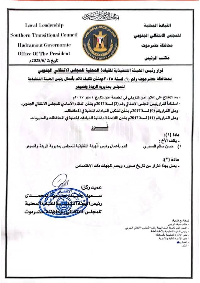 انتقالي حضرموت يصدر قرارًا بتكليف "البسيري" قائمًا بأعمال رئيس تنفيذية الريدة وقصيعر