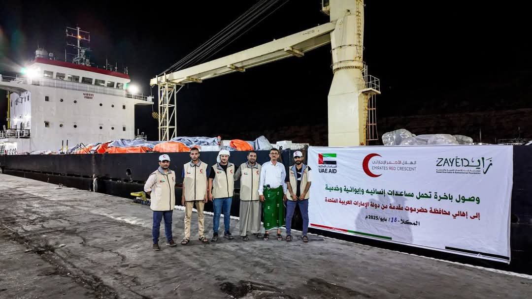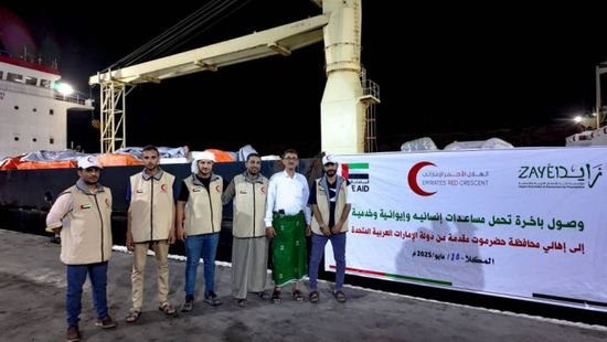 باخرة إماراتية تصل ميناء المكلا محمّلة بمساعدات غذائية وإنسانية وخدمية