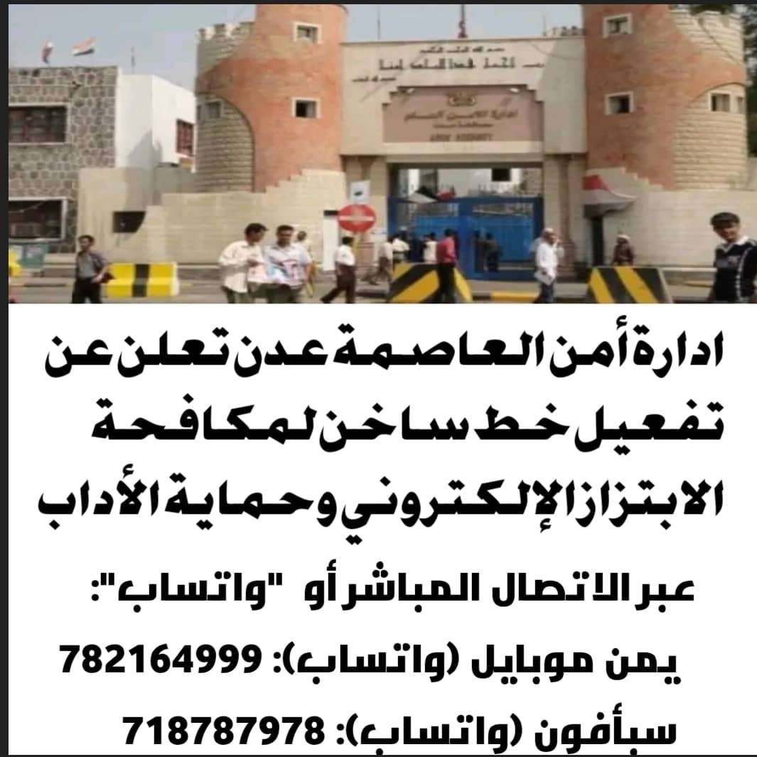إدارة أمن عدن تُفعّل خطًا ساخنًا لمكافحة الابتزاز الإلكتروني وحماية الأعراض.