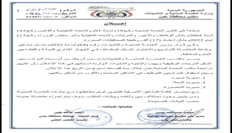 إعلان.. يعلن مكتب الخدمة المدنية والتأمينات محافظة عدن عن اعلان اسماء المرشحين لشغل الدرجات الوظيفية