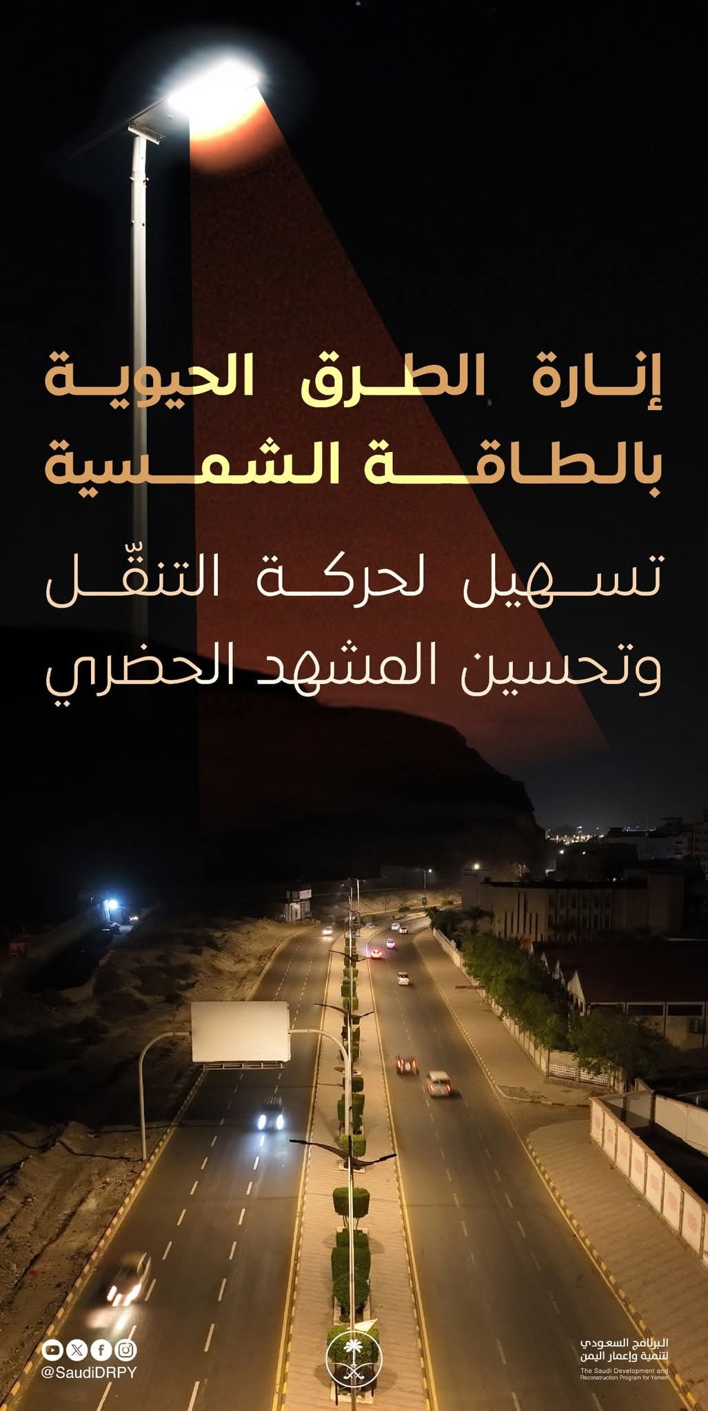 البرنامج السعودي لتنمية وإعمار اليمن ينفّذ مشاريع إنارة الطرق الحيوية بالطاقة الشمسية لتحسين المشهد الحضري وتسهيل حركة النقل.