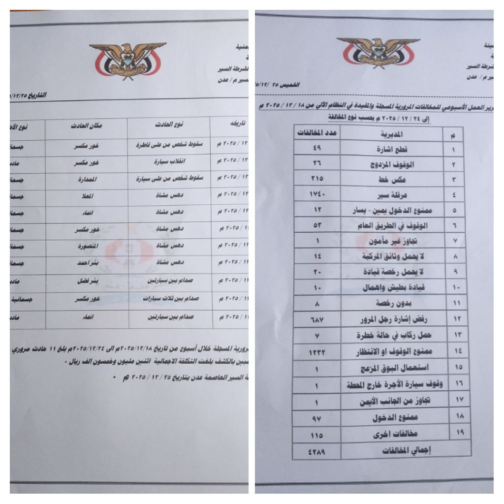 شرطة السير بعدن تصدر تقريرها الأسبوعي للمخالفات والحوادث المرورية