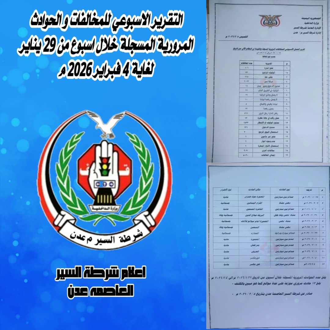 شرطة السير في عدن تسجل أكثر من 5 آلاف مخالفة مرورية خلال أسبوع وحادث وفاة واحد.