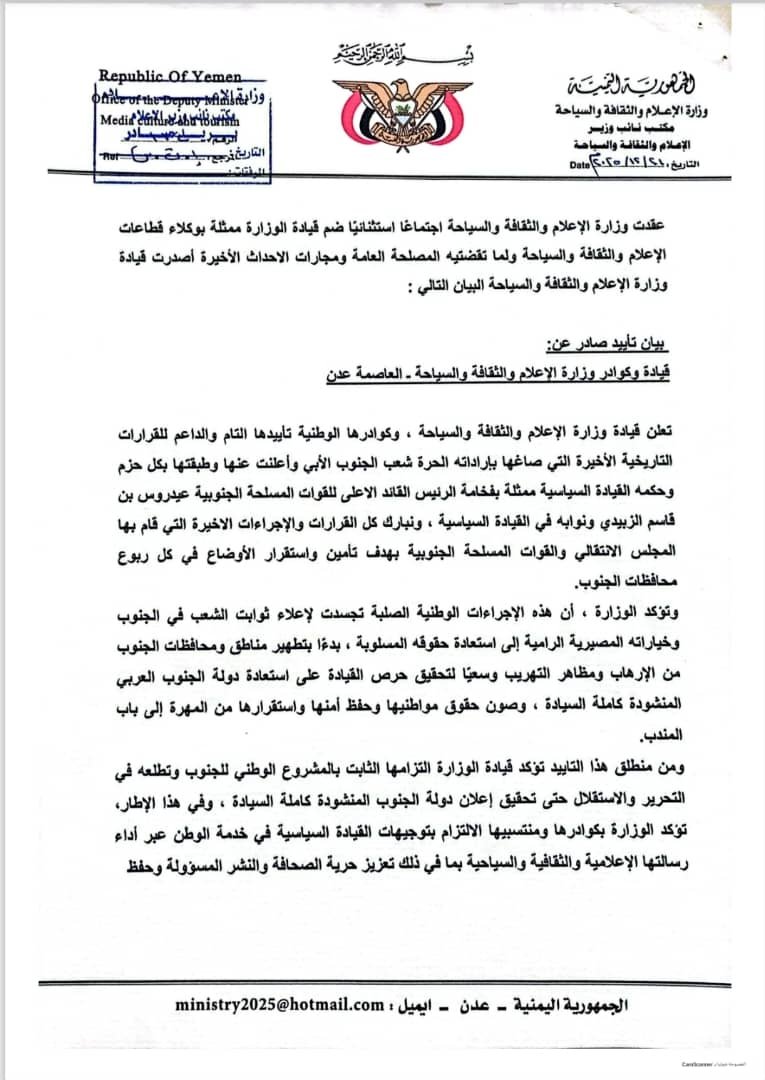 وزارة الإعلام والثقافة والسياحة تؤيد قرارات الرئيس الزُبيدي وتؤكد جاهزيتها للعمل خلف المجلس الانتقالي