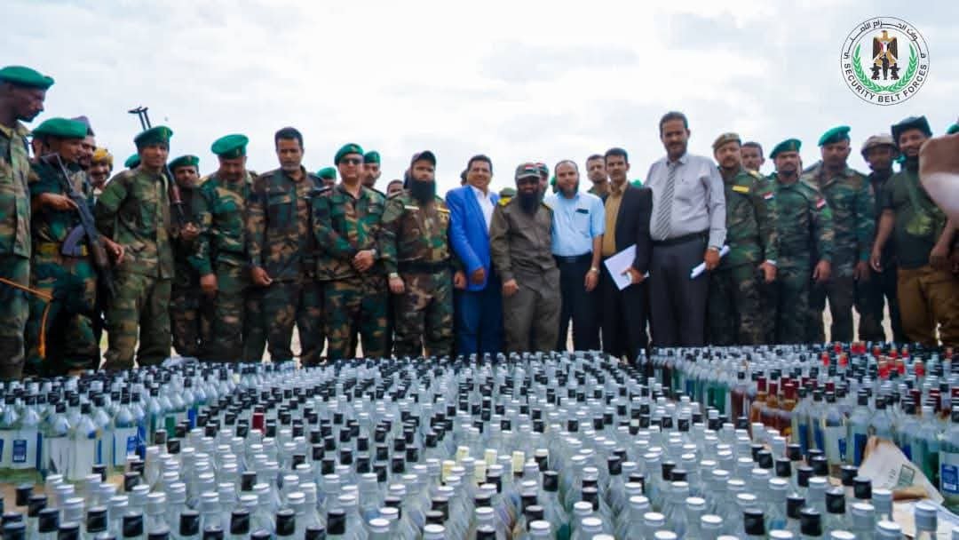 إدارة مكافحة المخدرات بقوات الحزام الأمني تتلف كمية كبيرة من الخمور المهربة