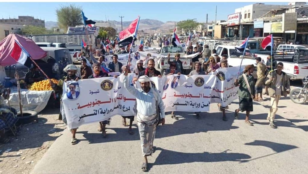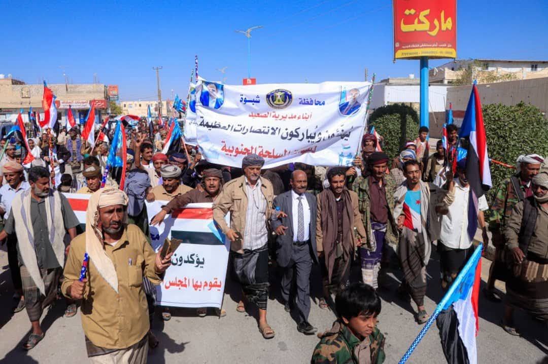 انتقالي شبوة ينظم مسيرة جماهيرية احتفالًا بانتصارات القوات الجنوبية في عارين وحضرموت