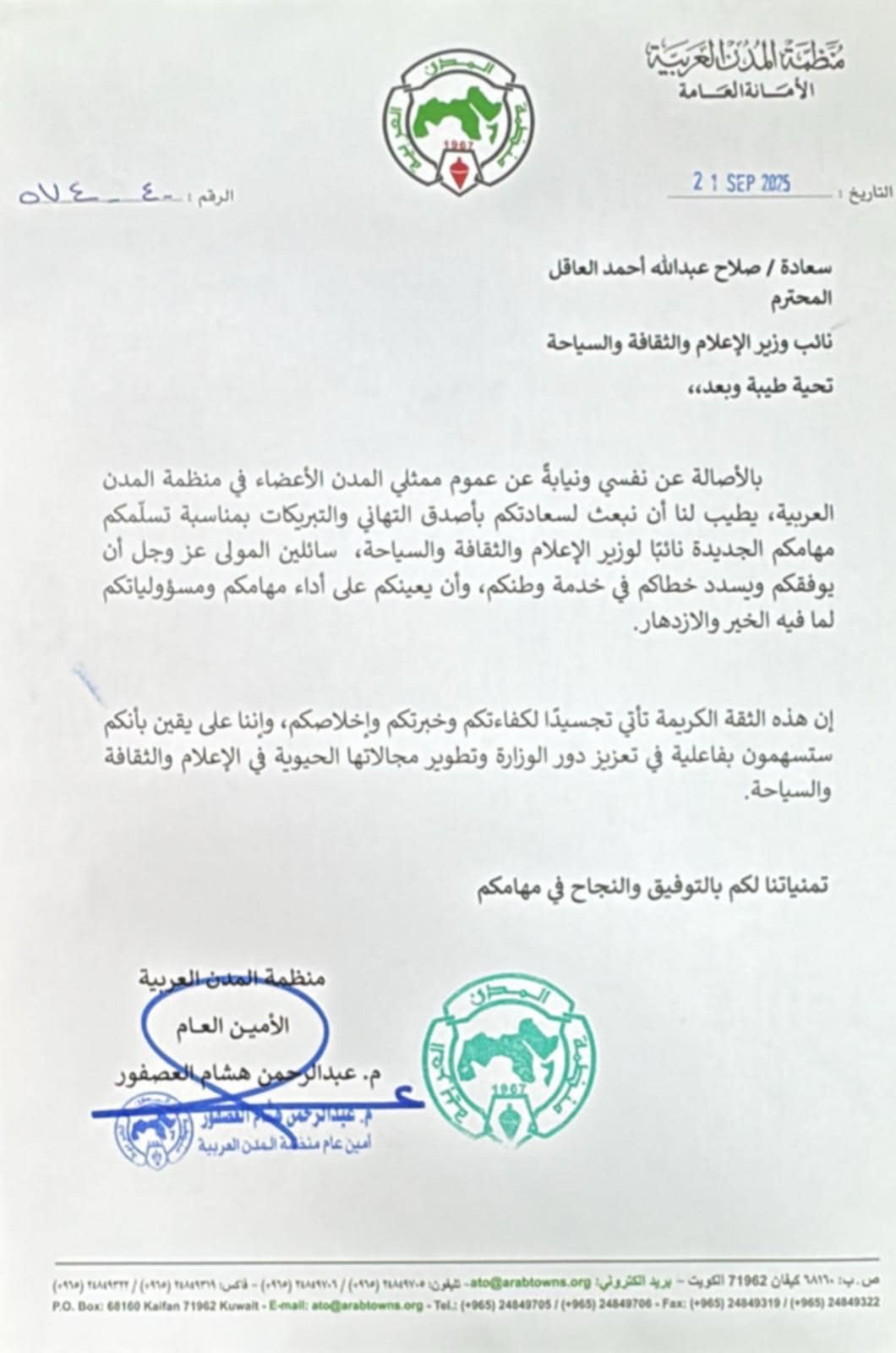 منظمة المدن العربية تهنئ نائب وزير الإعلام والثقافة والسياحة صلاح العاقل بتوليه مهامه الجديدة