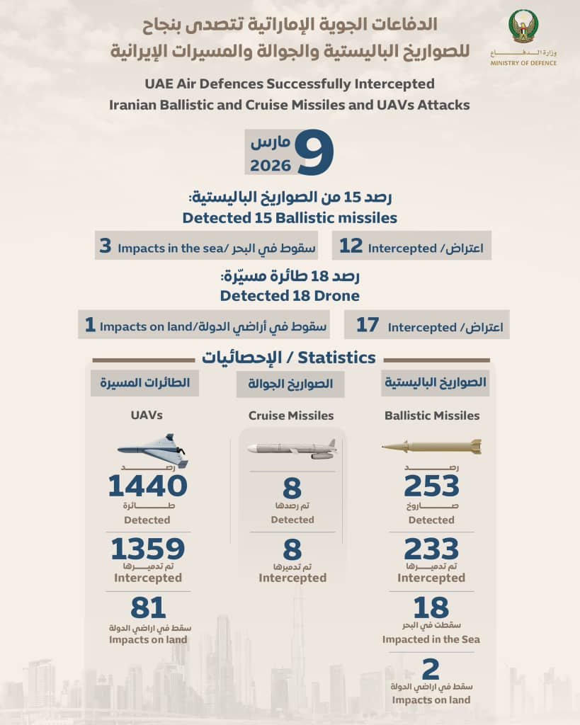 الدفاعات الجوية الإماراتية تتعامل مع 12 صاروخ باليستي و 17 طائرة مسيرة