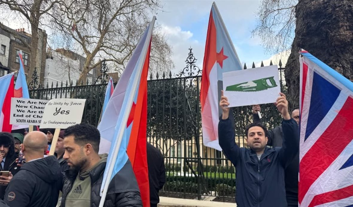 وقفة احتجاجية لأبناء الجنوب أمام السفارة السعودية في لندن تنديداً بقصف المدنيين وعسكرة المدن