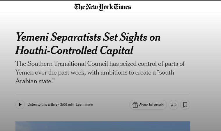 صحيفة امريكية: التوسع الجنوبي يغيّر مسار الحرب ويقرب اليمن من الانقسام النهائي