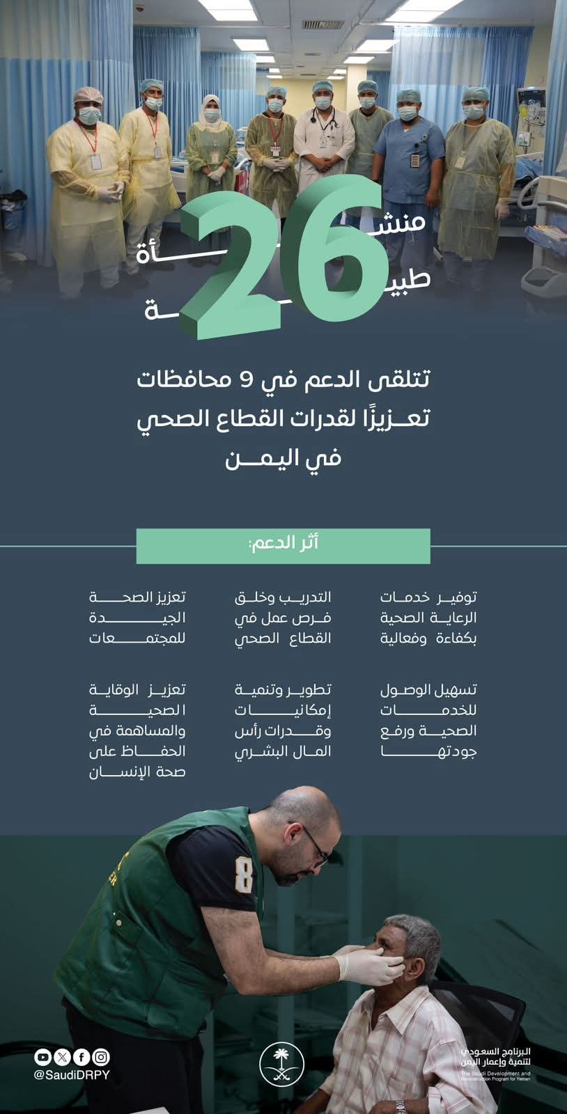 البرنامج السعودي يعزّز القطاع الصحي في اليمن عبر دعم 26 منشأة طبية في 9 محافظات.
