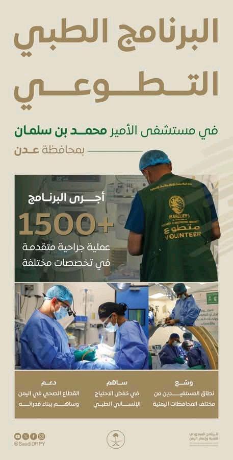البرنامج السعودي لتنمية وإعمار اليمن يدعم تنفيذ 1500 عملية جراحية متقدمة في مستشفى الأمير محمد بن سلمان.