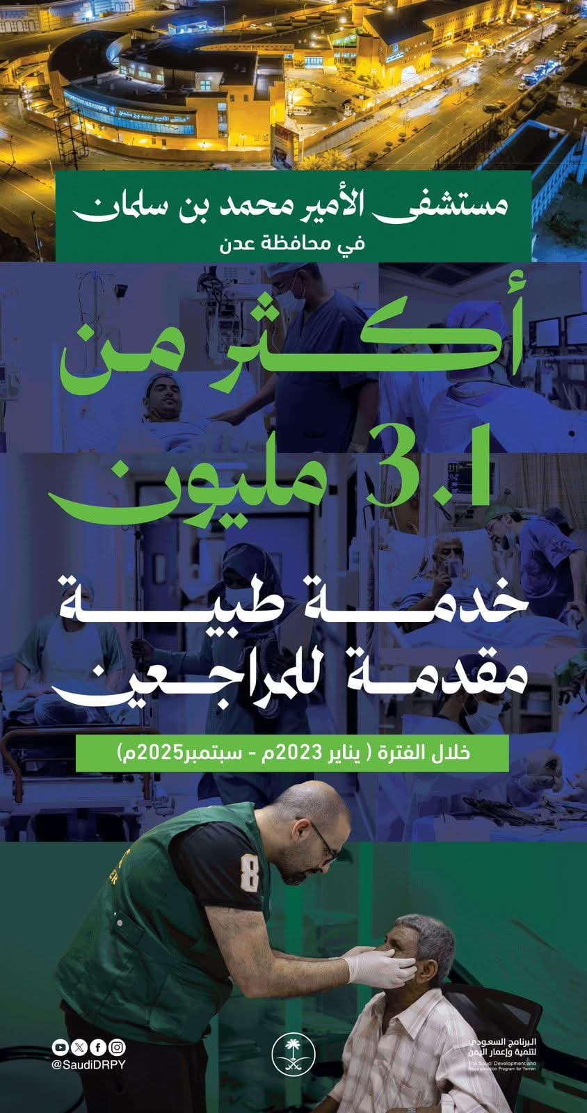 مستشفى الأمير محمد بن سلمان بعدن.. أكثر من 3.1 مليون خدمة طبية للمراجعين.