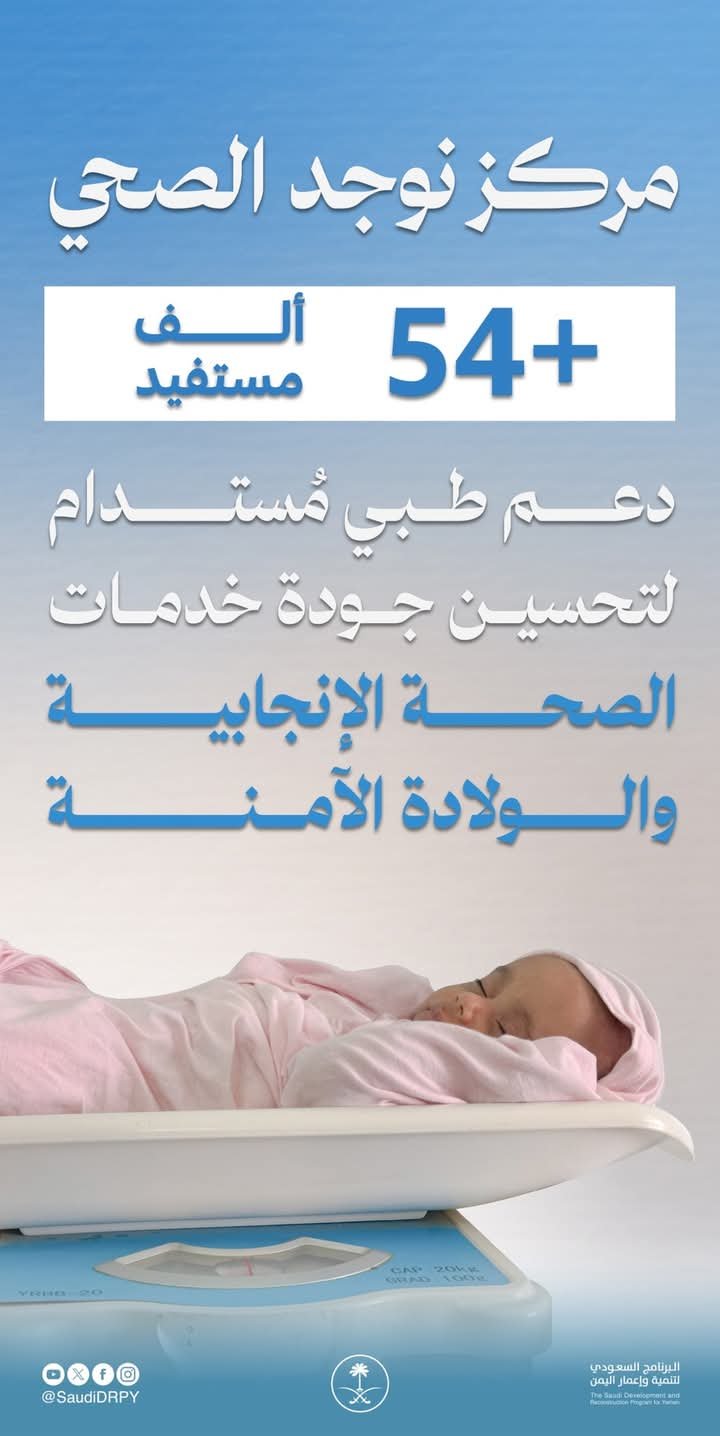 أكثر من 54 ألف مستفيد من خدمات رعاية الأمهات والمواليد بمركز نوجد الصحي بدعم من البرنامج السعودي لتنمية وإعمار اليمن.