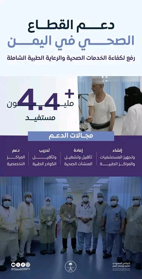 البرنامج السعودي لتنمية وإعمار اليمن يدعم القطاع الصحي بأكثر من 4.4 مليون مستفيد.