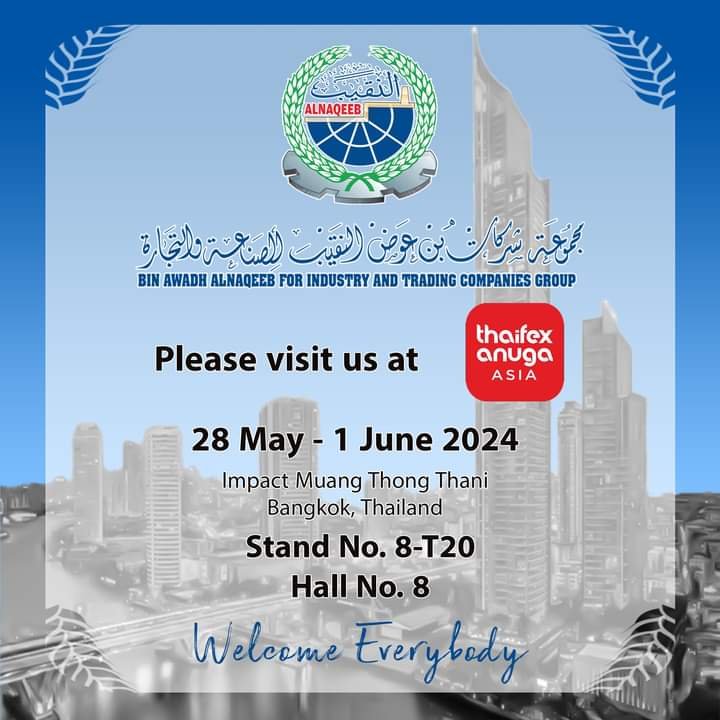 يسر مجموعة شركات بن عوض النقيب للصناعة والتجارة أن تعلن مشاركتها في معرض thaifex anuga asia 2024 ، من28/may إلى 1/june. زورونا في جناح رقم 8 ستاند رقم 8-20T لاكتشاف أحدث منتجاتنا. بانتظاركم!