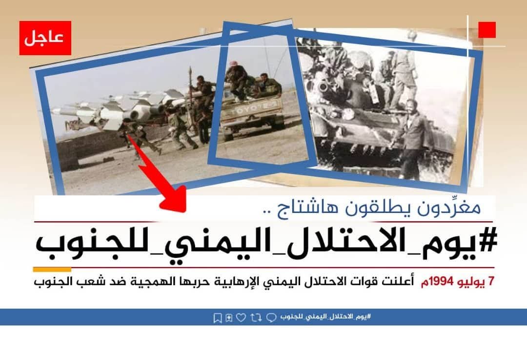 تزامنًا مع حلول الذكرى الـ(31) لسيطرة الشمال على الجنوب في 7 يوليو 94جنوبيون يطلقون وسم يوم الاحتلال اليمني للجنوب