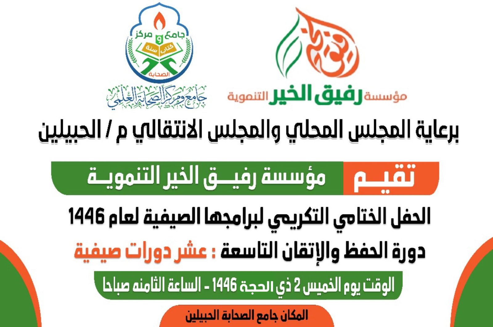 برعاية المجلس المحلي والمجلس الانتقالي في مدينة الحبيلين – محافظة لحج...... مؤسسة رفيق الخير التنموية تقيم غدًا حفلاً تكريميًا لبرامجها الصيفية لعام 1446هـ.
